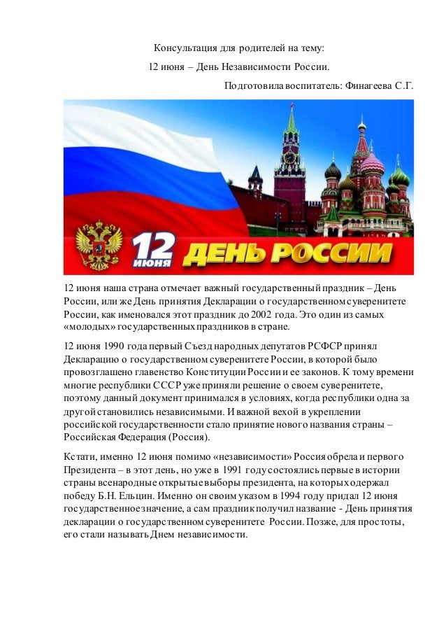 12 июня — государственный праздник, выходной день. Поскольку праздник выпадает на субботу, поэтому выходной переносится на понедельник, 14 июня. Что происходило вокруг этой даты в разные годы. Дата 12 июня выбрана потому, что именно в этот день в 1990 году съезд народных депутатов рсфср принял декларацию о государственном. 12 июня — день россии, всемирный день борьбы с детским трудом, а также еще 6 праздников, 1 памятная дата. Если говорить об истоках, то это самый молодой из красных дней отечественного календаря, но у него есть свои исторические вехи и традиции. В этот день в 1990 году первый съезд народных депутатов рсфср принял декларацию о государственном суверенитете россии. Считалось, что к этому времени змеи становятся очень. 12 июня стало праздничной датой с 11 июня 1992 года, по постановлению верховного совета российской федерации как «день принятия декларации о государственном суверенитете. Какой сегодня праздник, что можно, а что нельзя делать в этот день. Делимся с вами актуальной информацией об этом дне. Картинки по запросу что за праздник 12 июня Многие даже говорят, что это день независимости россии.